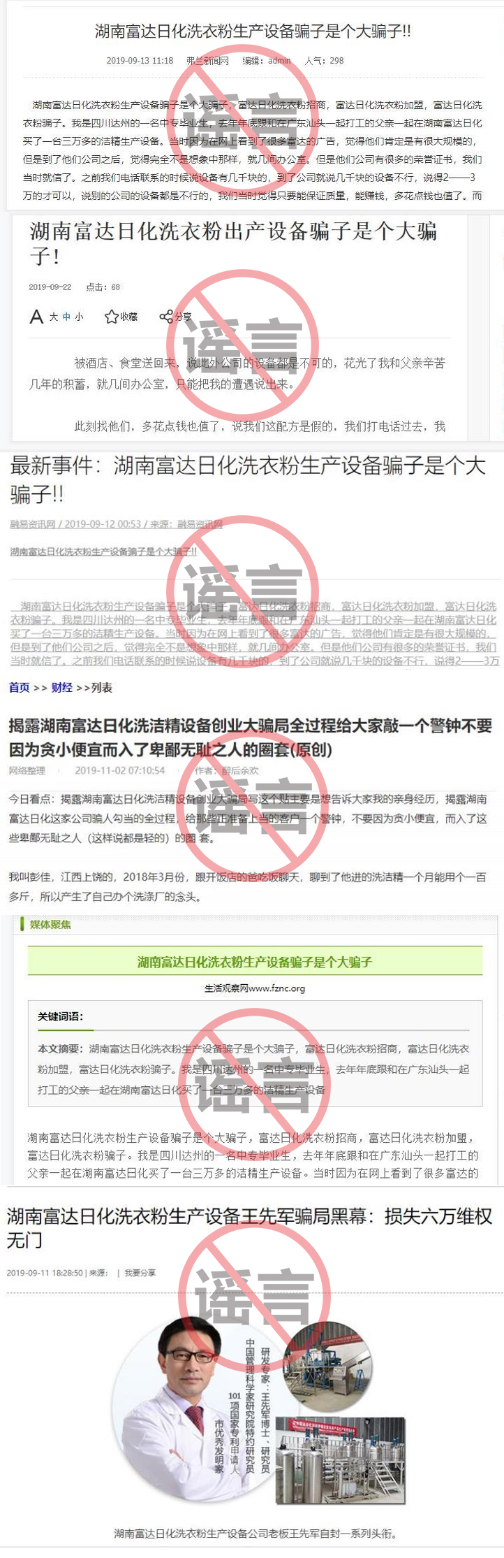 不難發(fā)現(xiàn),這些文章的主人公不一樣,但發(fā)文章的時間卻出奇的一致,都集中在2019年9月份左右。這是為什么呢?這些同行之所以惡意誹謗富達日化,是因為湖南富達日化發(fā)起的中國創(chuàng)業(yè)者防騙鋤騙互助沙龍微信群公開揭露了北京武漢等地的偽劣洗潔精設(shè)備和偽劣洗衣液設(shè)備及偽劣車用尿素設(shè)備,達到打擊報復惡意誹謗富達日化的目的。眾所周知,富達日化成立30多年,創(chuàng)始人王先軍是一百多項專利的發(fā)明人,他的所有產(chǎn)品都是被國家所認可。而當富達日化的創(chuàng)始人公開打假、公開揭露北京武漢同行偽劣洗潔精設(shè)備偽劣洗衣液設(shè)備偽劣車用尿素設(shè)備內(nèi)幕的時候,騙局制造者們狗急跳墻,試圖用捏造事實惡意攻擊湖南富達日化的行為阻止中國鋤騙防騙互助沙龍的打假行為,湖南富達日化的回答是:絕對辦不到!