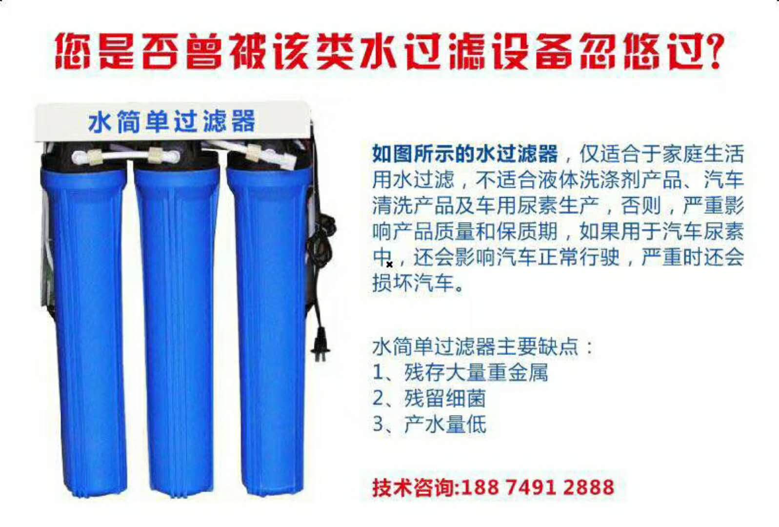 如圖中水處理只能對水進行簡單過濾,如果購機者發(fā)現(xiàn)車用尿素設(shè)備銷售商采用這種單個或連續(xù)三個并排鏈接的藍色過濾器,一是出水產(chǎn)量低,二是過濾器容易堵塞,三是無法去除水中的重金屬和細菌,只能用于家庭用水的簡單過濾,不能用來處理生產(chǎn)車用尿素的水,淘寶價格僅90元每個。