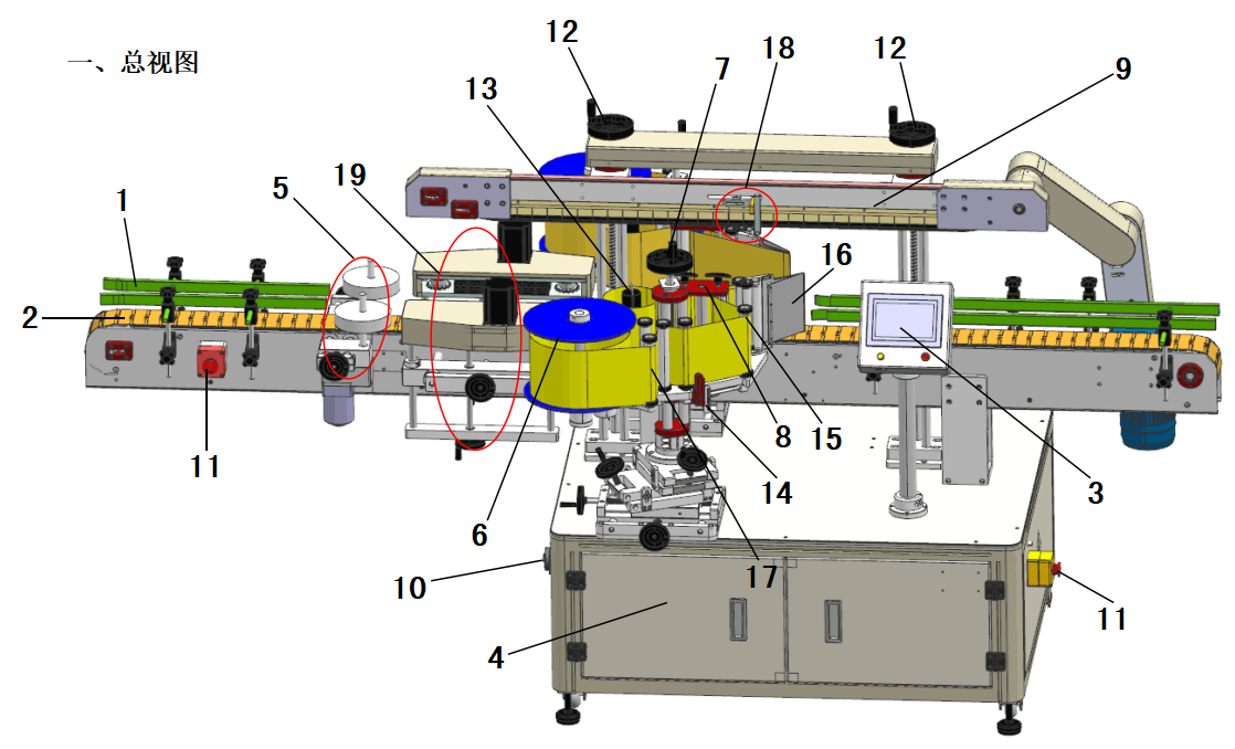 9、壓頂機(jī)構(gòu):用于壓緊瓶子,讓瓶子保持垂直從輸送帶過來(lái)保證貼標(biāo)精度。