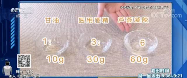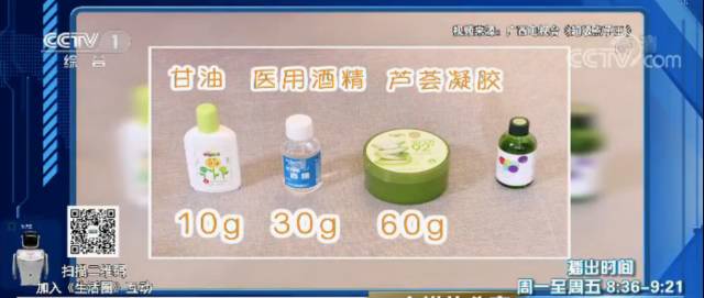 小貼士:95%的醫(yī)用酒精和甘油及蘆薈凝膠混合在一起,會(huì)稀釋酒精的濃度,再用來(lái)洗手就不會(huì)傷皮膚了。